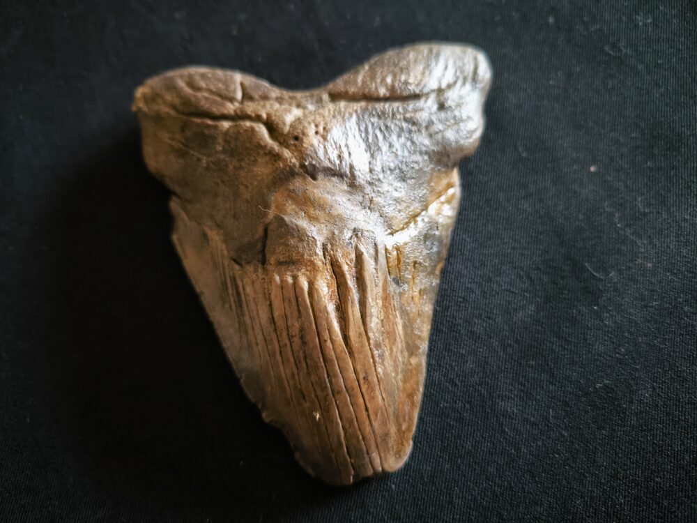 Großes Exemplar eines Haizahns der Spezies Carcharocles megalodon, die größte Haiart die jemals gelebt hat.